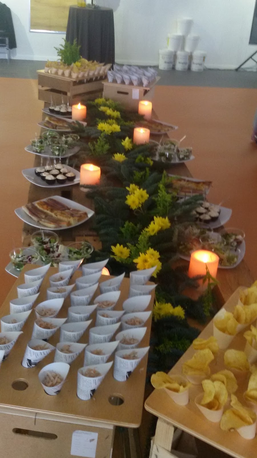 ¡Hola! ¿Que tal lleváis el comienzo de la navidad?, yo muy bien , con mucho trabajo jjjj. Desde que me propusieron llevar a cabo la celebración del cumpleaños de un chico muy internacional, mi cabeza no paro de pensar hasta que fue llevado a cabo tal proyecto. Graphenstone es una empresa joven y de mucho futuro, tan joven como su mentor y es por ello que quise hacer algo informal pero no dejando atrás la elegancia. Las instalaciones en la cual fue dicho evento, son parte de la industria y por ello elegimos para la mantelería y arreglos florales el amarillo y el gris, colores que identifican su firma. El crear una mesa de apoyo con palet no fue ni más ni menos que simbolizar donde estábamos (una fabrica de pinturas) y para la comida elegimos desde lo más nuestro de la mano de mi amigo Cesar Santos (cortador de jamón profesional) hasta lo más internacional como es el sushi , pasando por una variedad de fríos y calientes del cual se encargó el Catering Hnos. Lili. Y para endulzar tan bonito día, mi maravillosa pastelería familiar Sánchez.